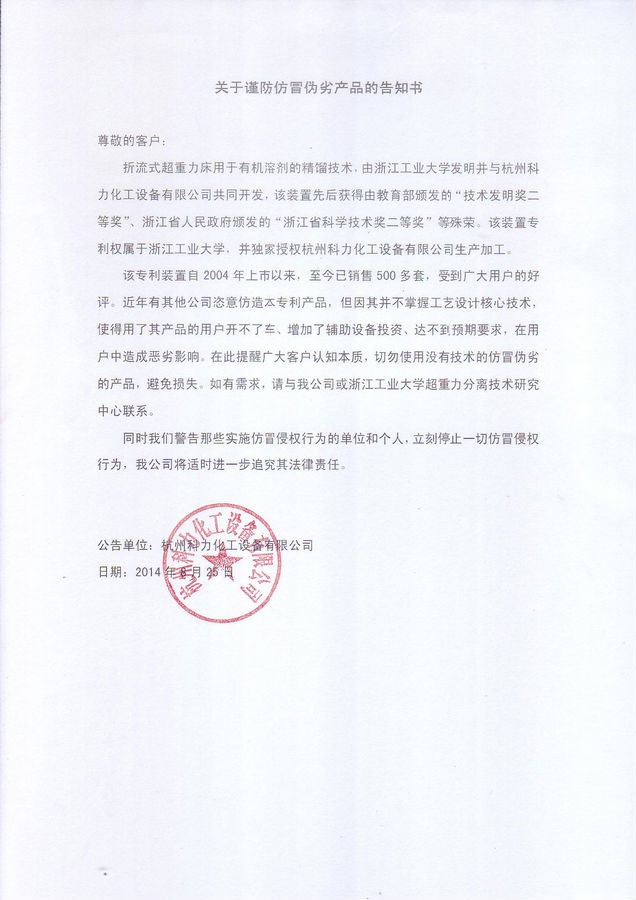 超重力精餾維權公告